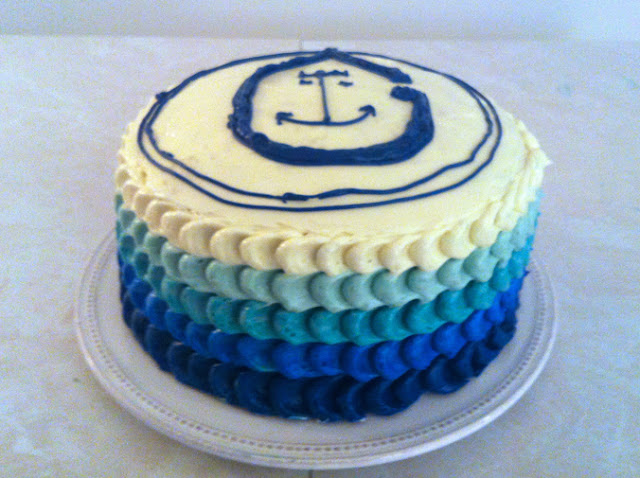 The cake was for my friend and surfing buddy's birthday. The design on the top of the cake is the logo for our surf club. If it had been less than 102 degrees in my house as I was frosting the cake, I perhaps could have drawn the logo better than a two year old, but as it was 102 degrees in my house, this will have to do : ) The cake is an almond cake, and the frosting is an Almond Swiss Buttercream frosting. Super tasty together. Yay for cakes inspired by the ocean!