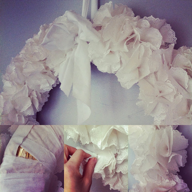 With the help of a couple of friends, we wrapped the straw wreath frame and proceeded to take a couple of hours of scrunching and hot gluing doilies. I recommend doing this with the friend for the entertainment alone.